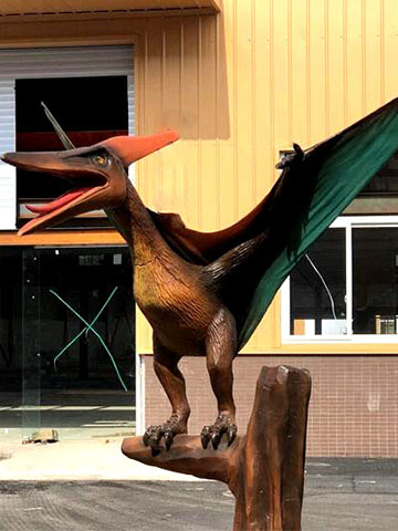 如图所示的3米翼龙模型是我们公司的经典热销款,完全张开双翼尺寸有3米,尖嘴长喙,红色冠饰,海蓝色翅膀,站在树枝上向天嚎叫的造型神采奕奕。而且灵活流畅的动作演示连带着翼龙的肌肉皮肤一起运动,简直以假乱真。